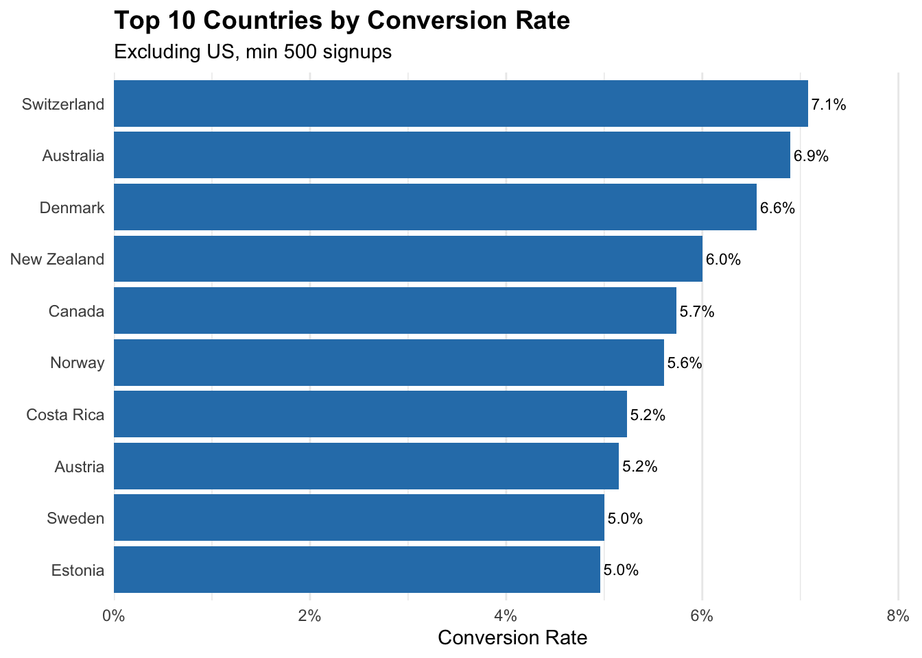 We filter to countries with at least 500 total signups to ensure meaningful conversion rate estimates.