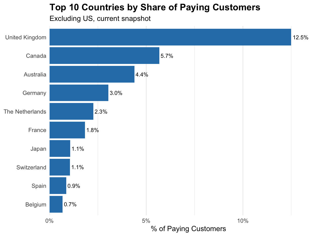 The UK contributes the largest share of paying customers outside the US, followed by Canada, Australia, and Germany.