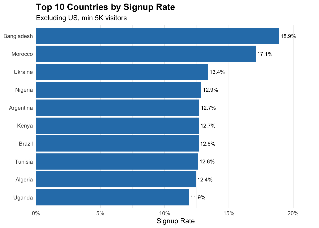 African, South Asian, and Latin American markets have the highest signup rates — often 3-5x higher than the US rate of 3.6%.