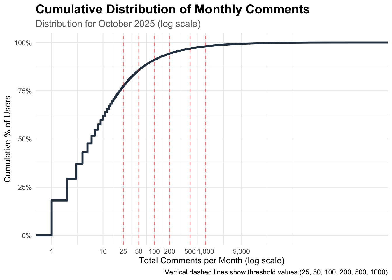 # Use most recent complete month for CDFlatest_month <-max(comments_data$month[comments_data$month <"2025-10-31"])comments_latest <- comments_data %>%filter(month == latest_month) %>%group_by(organization_id) %>%summarise(total_comments =sum(monthly_comments))ggplot(comments_latest, aes(x = total_comments)) +stat_ecdf(geom ="step", size =1.2, color ="#2C3E50") +geom_vline(xintercept = thresholds,linetype ="dashed",color ="red",alpha =0.5) +scale_x_log10(labels = comma, breaks =c(1, 10, 25, 50, 100, 200, 500, 1000, 5000)) +scale_y_continuous(labels = percent) +labs(title ="Cumulative Distribution of Monthly Comments",subtitle =paste0("Distribution for ", format(latest_month, "%B %Y"), " (log scale)"),x ="Total Comments per Month (log scale)",y ="Cumulative % of Users",caption ="Vertical dashed lines show threshold values (25, 50, 100, 200, 500, 1000)" ) +theme_minimal() +theme(plot.title =element_text(size =16, face ="bold"),plot.subtitle =element_text(size =12, color ="gray40") )