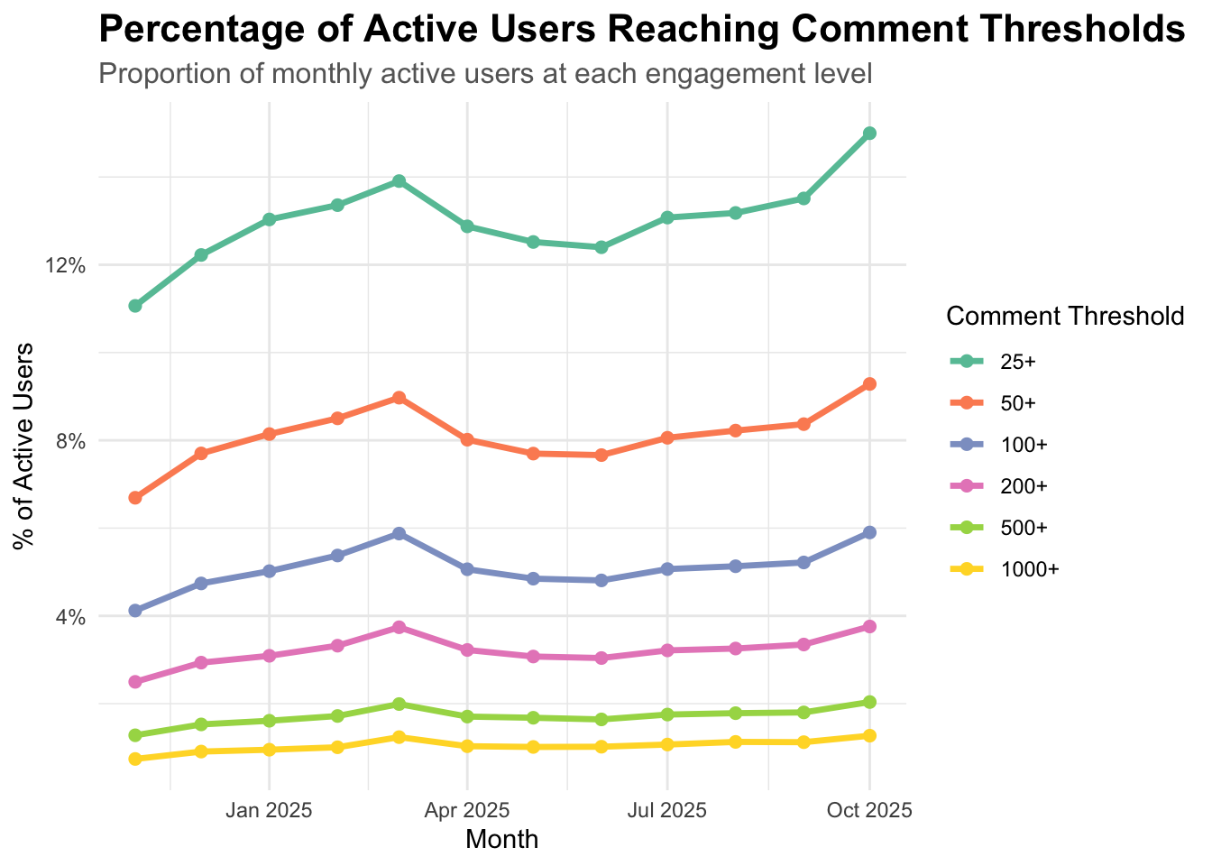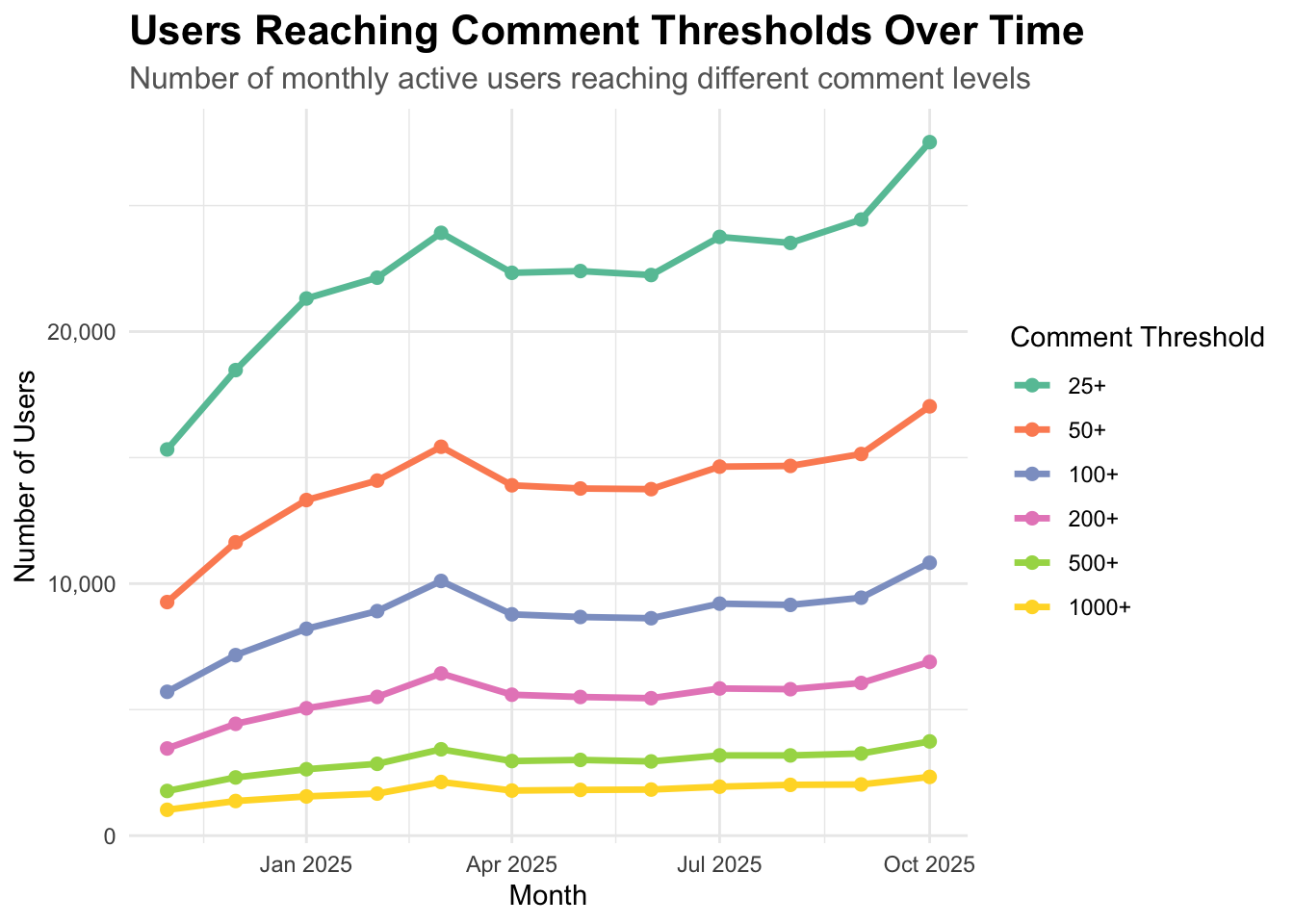 How many users reach different comment thresholds (25+, 50+, 100+, 200+, 500+, 1000+) each month