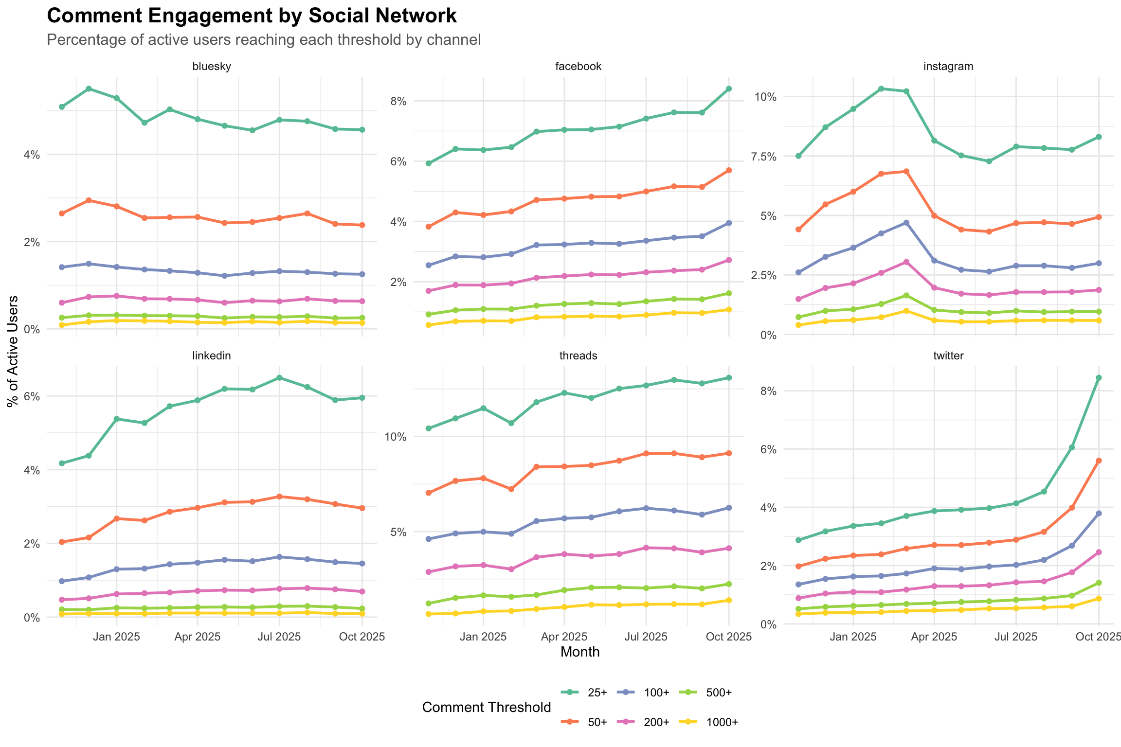 The channel breakdown reveals some interesting patterns. Threads consistently shows the highest percentage of users receiving at least 25 comments at around 13%. This makes sense, as Threads really tries to get its users replying in comments.