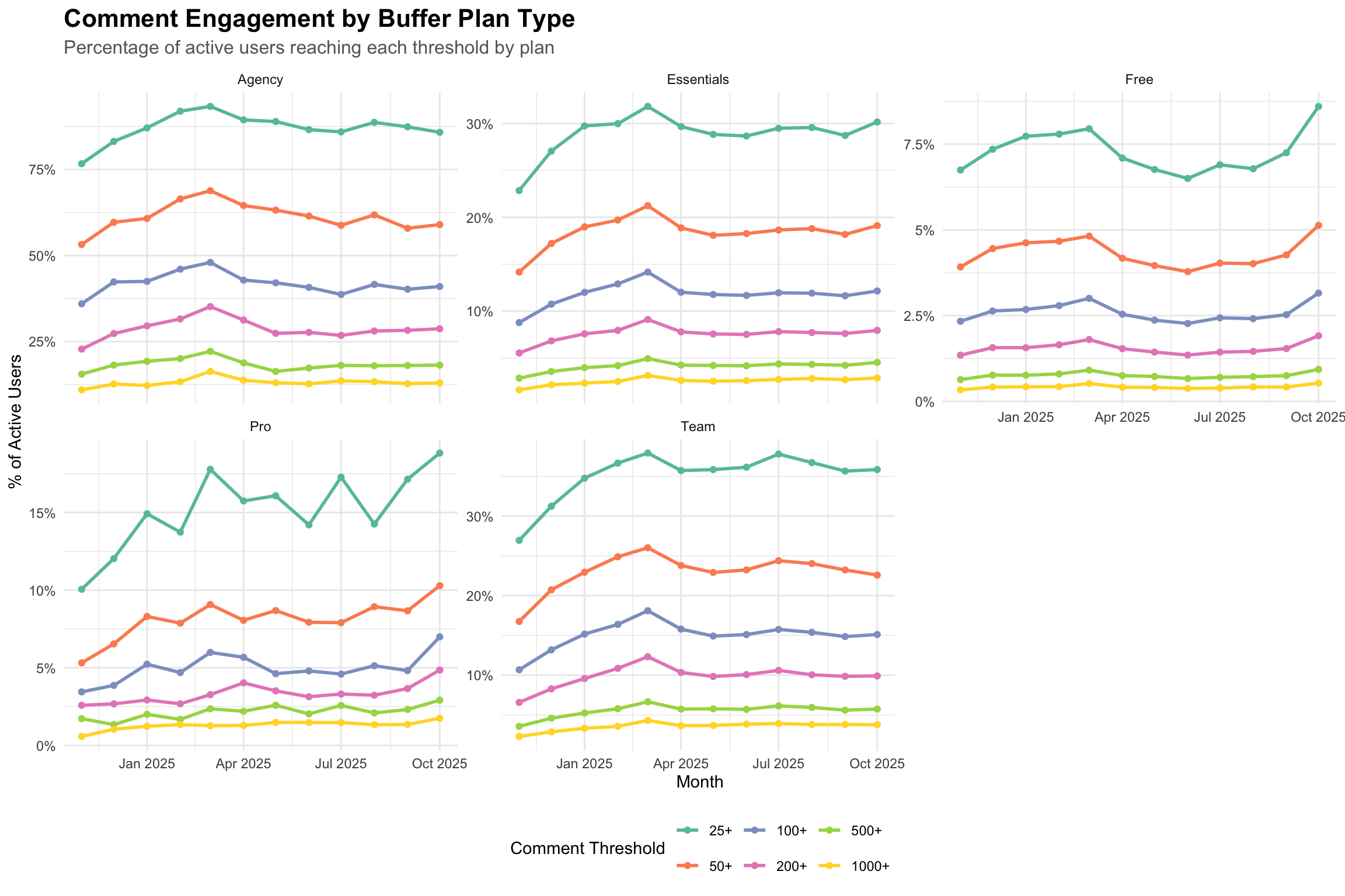 This percentage increases significantly for paid plans. Around 30% of Essentials customers and 36% of Team customers get at least 25 comments in a month. Agencies have even higher percentages, with 85-90% of users hitting the 25+ comment mark.