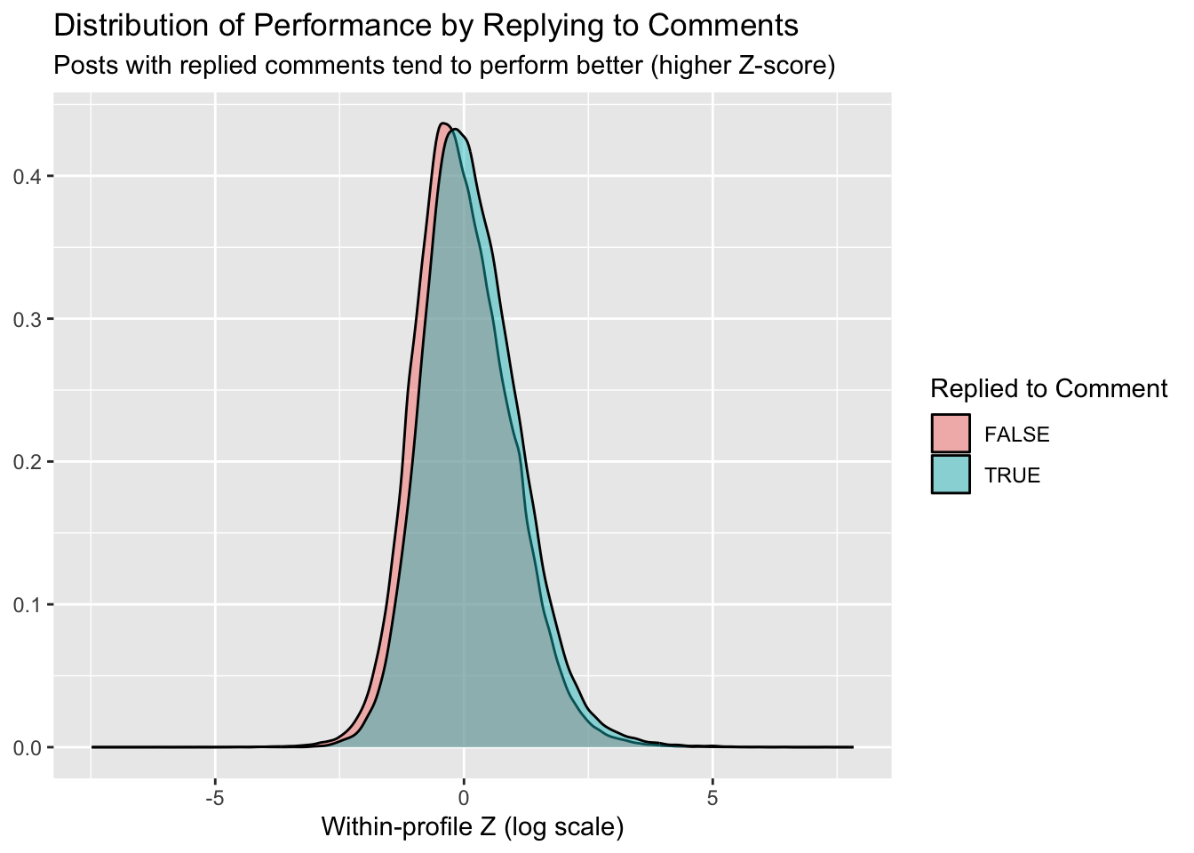 The two plots below show the relative lift in engagement for posts with comments that have been replied to. The shift to the right of engagement for posts that have received comments confirms that when people reply to comments, the number of engagements tends to be slightly higher.