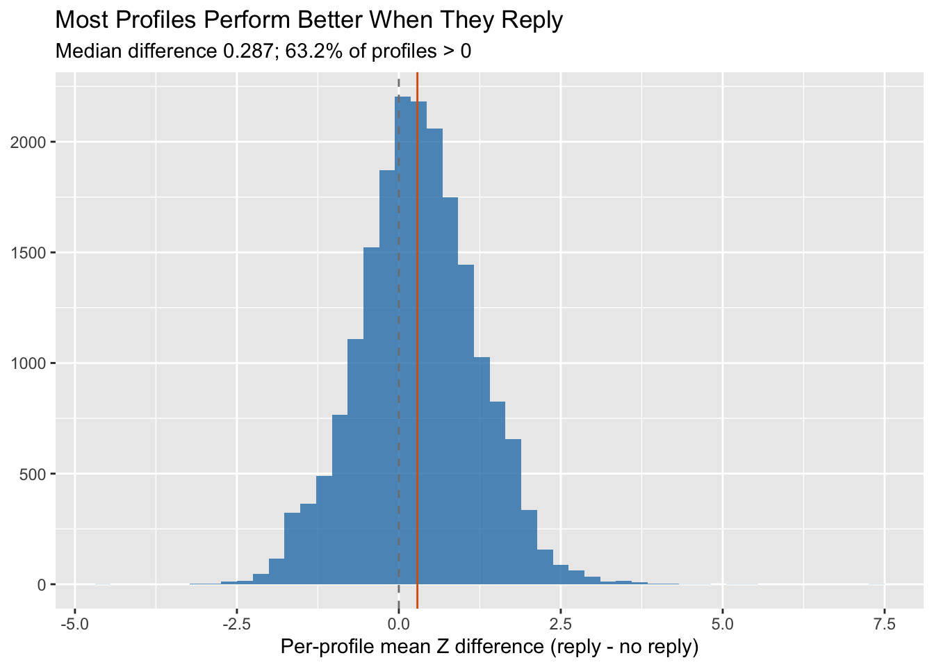 # Per-profile difference: mean Z (reply) - mean Z (no reply)profile_pair <- posts_z %>%group_by(profile_id, has_replied_comments) %>%summarise(mean_z =mean(z_log_engagements, na.rm =TRUE), .groups ='drop') %>% tidyr::pivot_wider(names_from = has_replied_comments, values_from = mean_z)diff_df <- profile_pair %>%mutate(diff =`TRUE`-`FALSE`)share_pos <-mean(diff_df$diff >0, na.rm =TRUE)med_diff <-median(diff_df$diff, na.rm =TRUE)ggplot(diff_df, aes(x = diff)) +geom_histogram(bins =50, fill ='#2c7fb8', alpha =0.8) +geom_vline(xintercept =0, linetype =2, color ='grey50') +geom_vline(xintercept = med_diff, color ='#d95f0e') +labs(x ="Per-profile mean Z difference (reply - no reply)", y =NULL,title ="Most Profiles Perform Better When They Reply",subtitle =paste0("Median difference ", round(med_diff, 3), "; ",round(100*share_pos, 1), "% of profiles > 0"))