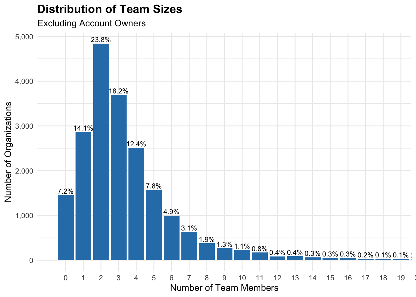 Most Team and Agency orgs are small. About 7% have no team members at all, meaning the account owner has not yet invited anyone. More than 80% of Team and Agency plan customers have 5 or fewer team members, and the median is 3. A small number of larger teams pull the average up to 4.1.