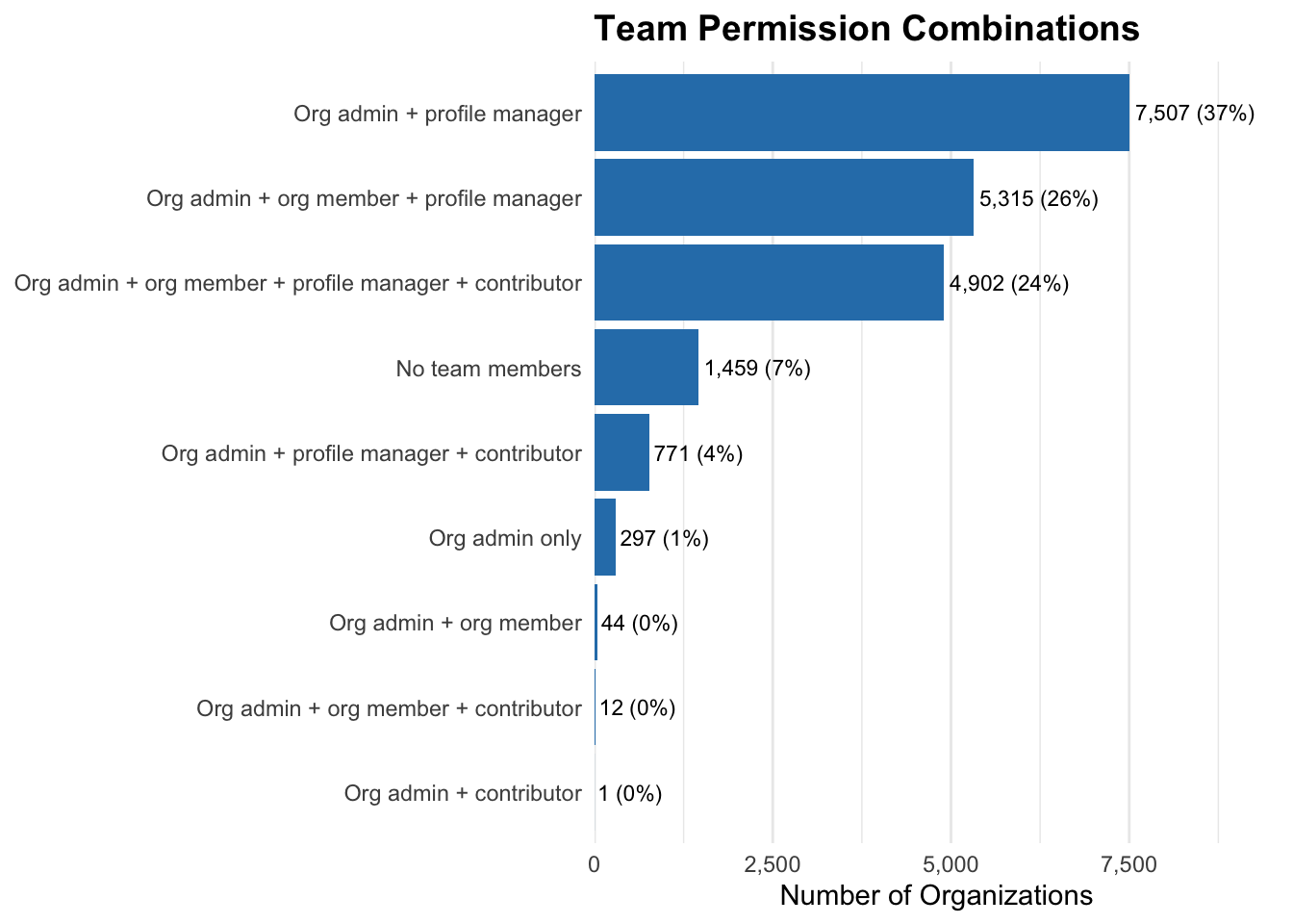 The most common setup is orgs where team members hold admin and manager roles with no contributors, covering about 63% of orgs. About 28% already have at least one profile contributor.