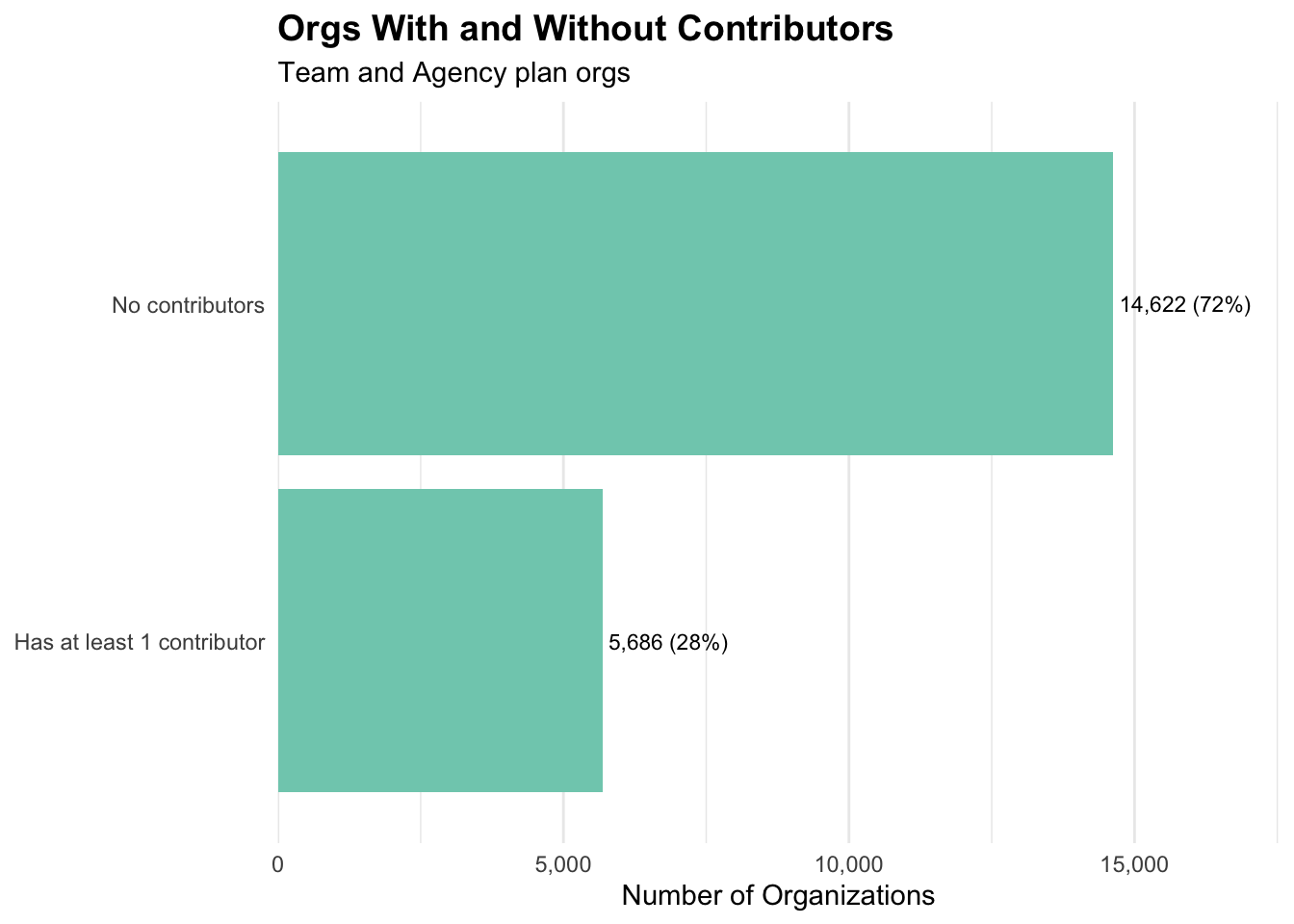 About 5,700 orgs, roughly 28% of all Team and Agency plan orgs, have at least one contributor today. Among those orgs, the median is 1 contributor and the mean is 2.8, so most orgs using the contributor role are using it lightly. A small number of larger orgs are pulling the average up.