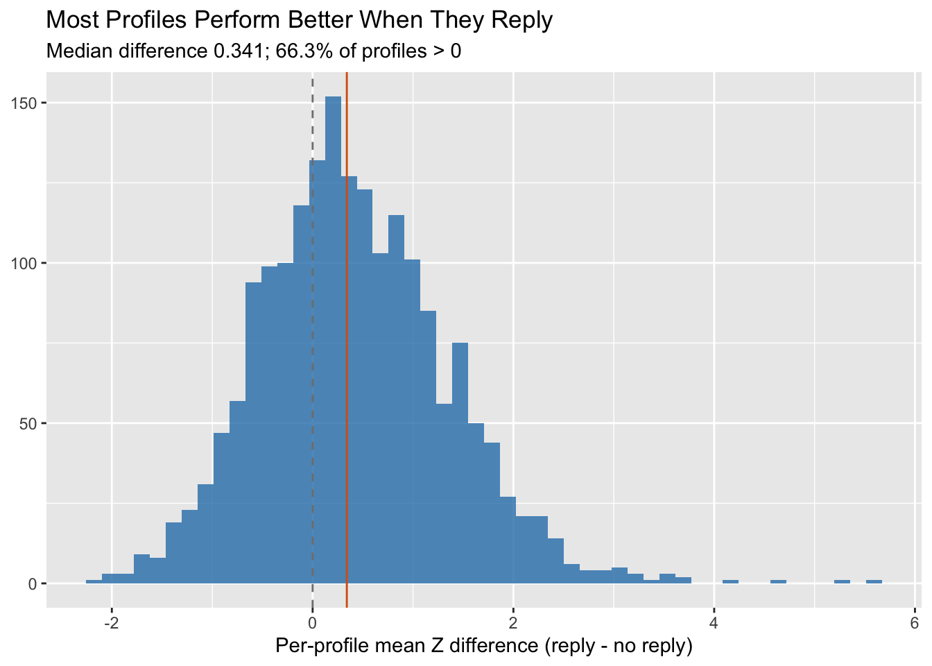 # build per-profile means (needed for difference plot)profile_pair <- posts_z %>%group_by(profile_id, has_replied_comments) %>%summarise(mean_z =mean(z_log_engagements, na.rm =TRUE), .groups ='drop') %>% tidyr::pivot_wider(names_from = has_replied_comments, values_from = mean_z)# 3) Per-profile difference: mean Z (reply) - mean Z (no reply)diff_df <- profile_pair %>%mutate(diff =`TRUE`-`FALSE`) share_pos <-mean(diff_df$diff >0, na.rm =TRUE)med_diff <-median(diff_df$diff, na.rm =TRUE)ggplot(diff_df, aes(x = diff)) +geom_histogram(bins =50, fill ='#2c7fb8', alpha =0.8) +geom_vline(xintercept =0, linetype =2, color ='grey50') +geom_vline(xintercept = med_diff, color ='#d95f0e') +labs(x ="Per-profile mean Z difference (reply - no reply)", y =NULL,title ="Most Profiles Perform Better When They Reply",subtitle =paste0("Median difference ", round(med_diff, 3), "; ",round(100*share_pos, 1), "% of profiles > 0"))